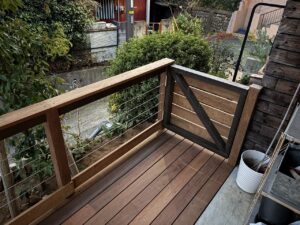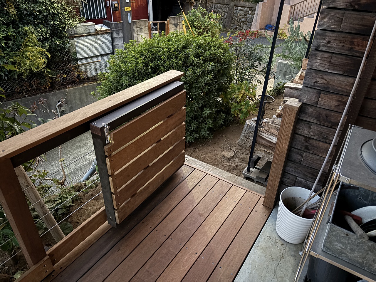 東京郊外の高台にあるこだわりのお宅。小型犬2匹を庭で遊ばせたい、そのためのデッキを作りたいとのご要望です。